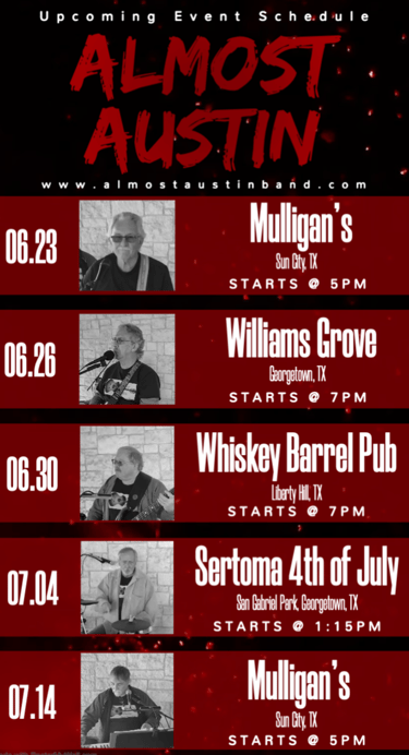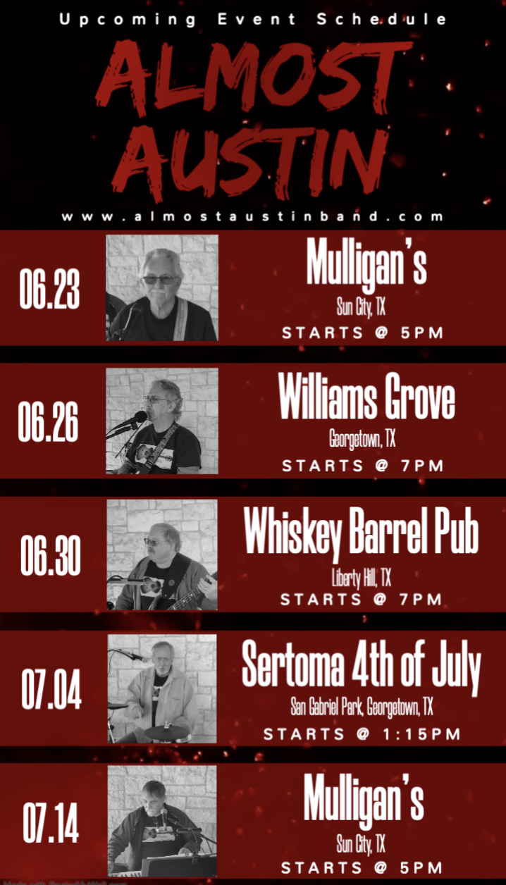 Hey Almost Austin Fans! We took some time off to prepare some new songs and get some vacay time in, but now we're ready to rock! We've got some great shows coming up, in both familiar and new venues, starting with Mulligan's in Sun City this Friday, June 23rd, from 5-7pm.